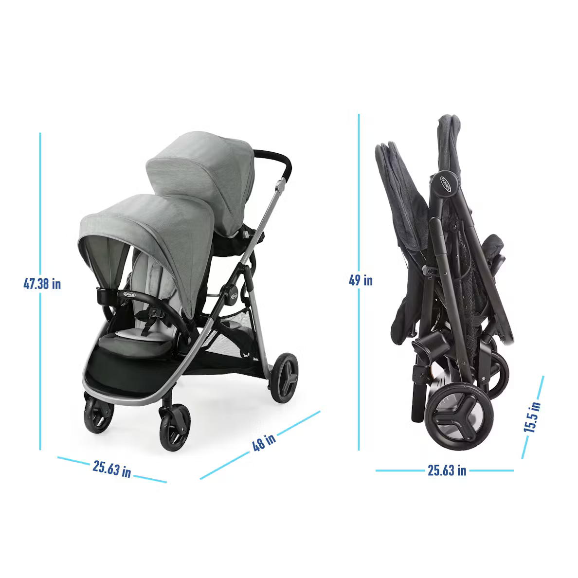 Meet the Graco® Ready2Grow™ LX 2.0 Double Stroller, now with a fresh look and upgraded features. This stroller rides like a double stroller but folds like a single, and includes 2 seats, a bench seat, and a standing platform to accommodate your growing family. Added body support and large canopies with visors make the ride even more comfy for your little ones.
